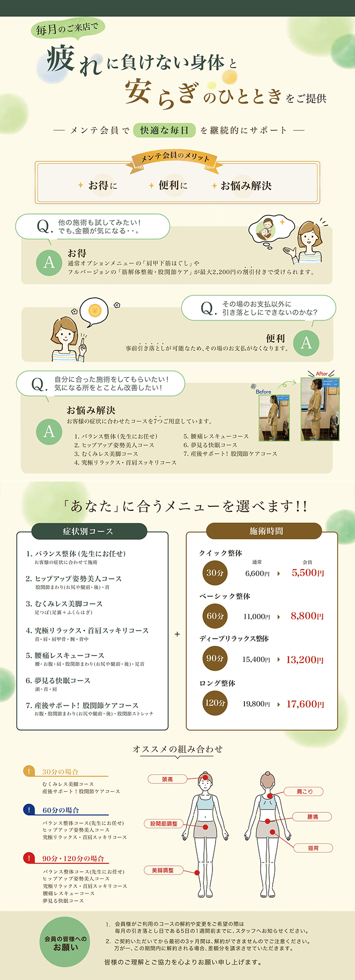 初回限定価格でご提供後、2回目以降は1回税込11,000円(税込)ですが、特別な「メンテ会員優待価格」で継続的なサポートもしております。お客様に合ったメニュー選びのための詳細は説明書きをご覧になるか、コース紹介動画をご覧ください。ご予約をお待ちしております。